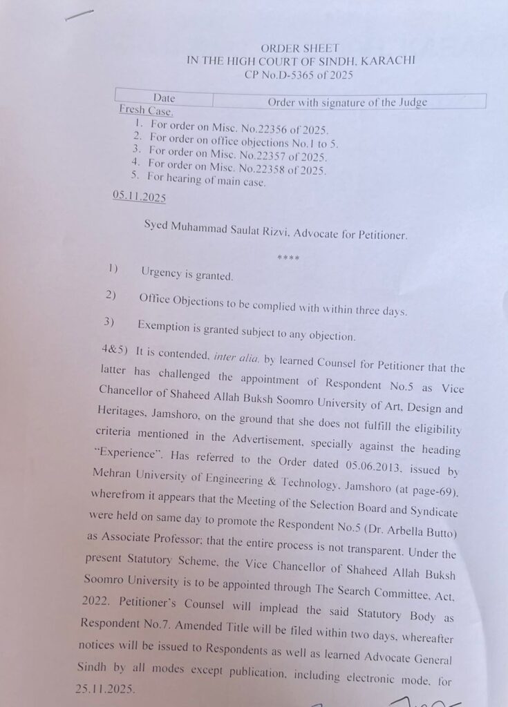تفصیلات کے مطابق شہید اللہ بخش سومرو یونیورسٹی آف آرٹ ڈیزائن اینڈ ہیریٹیجز جامشورو کی وائس چانسلر کی تقرری کے خلاف درخواست کی سماعت بدھ کو سندھ ہائی کورٹ میں جسٹس فیصل کی عدالت میں ہوئی ۔ عدالت نے وائس چانسلر ارابیلہ بھٹو کی تقرری کے خلاف درخواست پر نوٹس جاری کر دیئے ہیں ۔