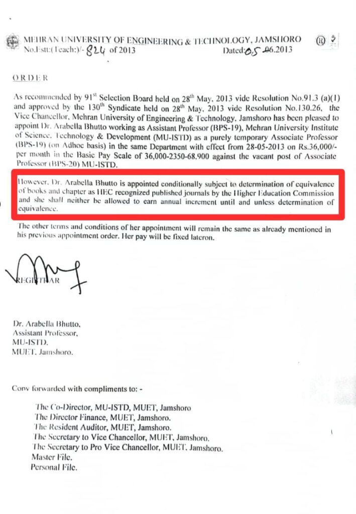 سلیکشن بورڈ اور سنڈیکیٹ کے منٹس دو روز بعد 30 مئی کو اس وقت کے رجسڑار اور موجودہ وائس چانسلر ڈاکٹر طہ حسین نے جاری کر دیئے تھے ۔ بعد ازاں 27 جون 2013 کو دوبارہ ڈاکٹر ارابیلہ بھٹو کے لئے منٹس تیار کیئے گئے ، جس میں لکھا کہ ڈاکٹر ارابیلہ بھٹو کی کتابیں اور ریسرچ مقالہ جات کو ہائر ایجوکیشن کمیشن سے معادلہ کے طور پر تصدیق کرایا جائے تب تک کیلئے ان کی ایک انکریمنٹ بند رہے گی ۔ جب کہ منٹس سے پہلے ہی آرڈر 5 جون 2013 جاری کر دیا گیا تھا اور آرڈر کی شرائط کو نئے منٹس میں شامل کر دیا گیا ۔