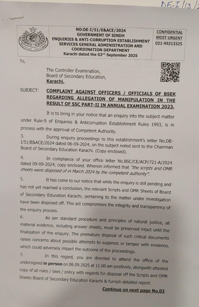 اینٹی کرپشن کی جانب سے میٹرک بورڈ حکام کو 2 ستمبر 2025 کو ایک لیٹر لکھا جس میں کہا گیا کہ اس معاملے میں شفاف انکوائری کے لئے ضروری ہے کہ آپ OMR شیٹس اور 93 رول نمبرز کی کل 651 امتحانی کاپیاں اور ایوارڈز فراہم کریں ۔