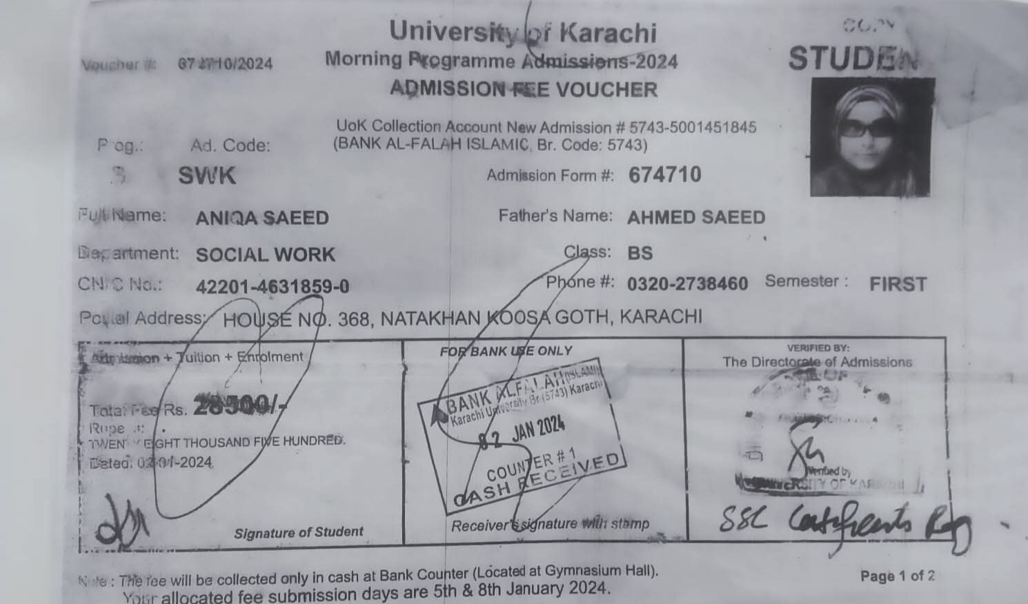 حادثے کے فوری بعد طالبہ کو قریب اسپتال لے جایا گیا لیکن طالبہ جانبر نہ ہو سکی۔ طالبہ کی شناخت انیقہ سعید کے نام سے ہوئی جو سوشل ورک ڈپارٹمنٹ میں بی ایس کی طالبہ تھی۔
