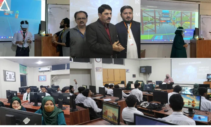 مہمان اسپیکر اور وی آر ایکسپرٹ وقاص احمد نے وی آر کی تعریف، اس کے تکنیکی پہلوؤں، مارکیٹ گروتھ اور 2030 تک تقریباً 44 بلین ڈالر تک پہنچنے کے امکانات پر روشنی ڈالی۔ انہوں نے واضح کیا کہ یونٹی، سی شارپ (C#)، پلگ اِنز اور دیگر ٹولز کے ذریعے کس طرح وی آر گیمز اور ایپلیکیشنز تیار کی جا سکتی ہیں۔ طلبہ کو عملی طور پر وی آر ہیڈسیٹ کے ذریعے تھری ڈی اینیمیشن، موونگ آبجیکٹس اور مکمل ورچوئل ماحول کا تجربہ بھی کروایا گیا، جس نے سیکھنے کے عمل کو مزید مؤثر بنا دیا۔