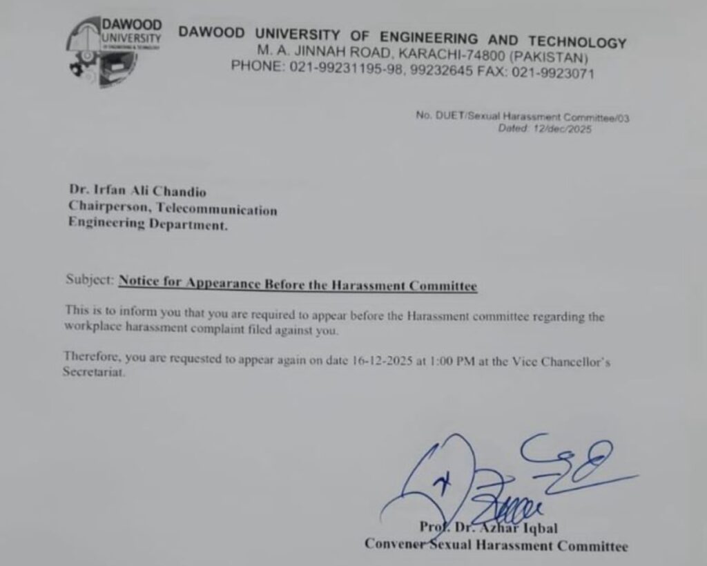 تفصیلات کے مطابق ٹیلی کمیونیکیشن انجینئرنگ ڈیپارٹمنٹ کے چیئرپرسن ڈاکٹر عرفان علی چانڈیو کے خلاف جنسی ہراسانی کی شکایت پر حراسانی کمیٹی قائم کی گئی تھی جس کے سامنے پیش ہونے کا نوٹس بھی 12 دسمبر کو سامنے آیا تھا جس میں عرفان علی کو کمیٹی میں پیش ہو کر اپنے الزام کے خلاف ثبوت اور شواہد مانگے گئے تھے ۔