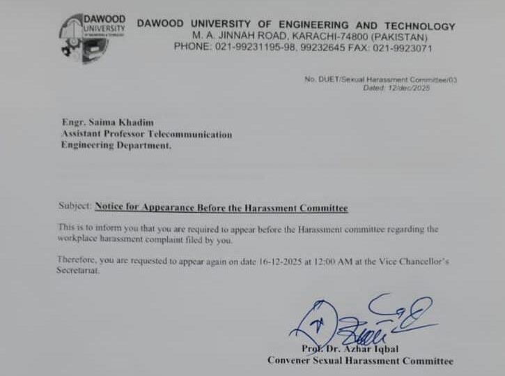 کراچی : داؤد یونیورسٹی آف انجنیئرنگ اینڈ ٹیکنالوجی کے خلاف ورک پلیس ہراسانی کی انکوائری مکمل کر  لی گئی ہے ، ٹیلی کمیونیکیشن انجینئرنگ ڈیپارٹمنٹ کے چیئرپرسن ڈاکٹر عرفان علی کو 16 دسمبر کو ہراسانی کمیٹی میں پیش ہونے کا حکم بھی دیا گیا تھا ۔