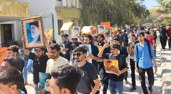 کراچی : وفاقی اردو یونیورسٹی، گلشن کیمپس میں شہید رہبرِ معظم کی شہادت پر امامیہ اسٹوڈنٹس آرگنائزیشن جامعہ وفاقی اردو یونٹ، گلشن کیمپس کے زیرِ اہتمام طلبہ کی جانب سے ایک پُرامن اور منظم اجتماعی ریلی نکالی گئی ۔ ریلی میں مختلف شعبہ جات سے تعلق رکھنے والے طلبہ نے بڑی تعداد میں شرکت کی اور شہید رہبر کو خراجِ عقیدت پیش کیا۔